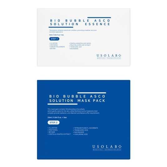 BIO BUBBLE ASCO SOLUTION ESSENCE: Water (Aqua), Sodium Bicarbonate, Glycerin, Xanthan Gum, Alcohol, Hydroxyethylcellulose, Carbomer, Chlorphenesin, Caprylic/Capric Triglyceride, 1,2-Hexanediol, Eucalyptus Globulus Leaf Oil, Sodium Hyaluronate, Pogostemon Cablin Oil, Betaine, Allantoin, Niacinamide, Tranexamic Acid, Panthenol, Centella Asiatica Leaf Water, Salvia Sclarea (Clary) Oil, Rosmarinus Officinalis (Rosemary) Leaf Oil, Butylene Glycol, Pentylene Glycol, Pinus Palustris Leaf Extract, Ulmus Davidiana Root Extract, Oenothera Biennis (Evening Primrose) Flower Extract, Pueraria Lobata Root Extract, Sodium Hyaluronate Crosspolymer, Hydrolyzed Hyaluronic Acid, Centella Asiatica Extract, Sodium Hyaluronate Crosspolymer, Hydrolyzed Hyaluronic Acid,, Caprylyl Glycol, Hydrolyzed Sodium Hyaluronate, Potassium Hyaluronate