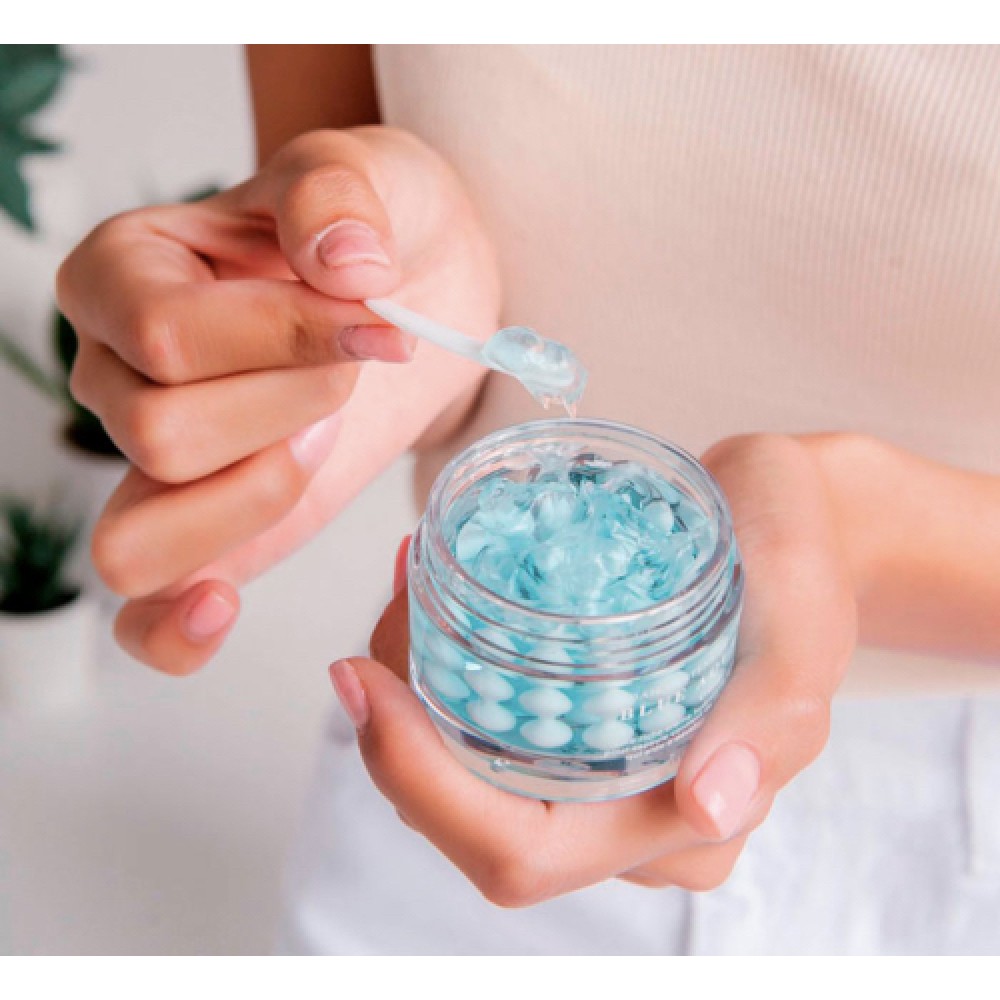 Особливість крему — унікальна капсульна технологія. Продукт має ніжну гелеву основу, всередині якої розміщені блакитні кремові капсули з активними компонентами. Під час нанесення гель змішується з капсулами, утворюючи однорідну текстуру, яка легко розподіляється по шкірі та швидко поглинається. Така система дозволяє зберігати стабільність активів і забезпечує тривале, пролонговане зволоження протягом усього дня.