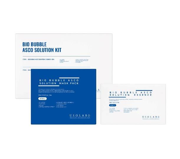 BIO BUBBLE ASCO SOLUTION ESSENCE: Water (Aqua), Sodium Bicarbonate, Glycerin, Xanthan Gum, Alcohol, Hydroxyethylcellulose, Carbomer, Chlorphenesin, Caprylic/Capric Triglyceride, 1,2-Hexanediol, Eucalyptus Globulus Leaf Oil, Sodium Hyaluronate, Pogostemon Cablin Oil, Betaine, Allantoin, Niacinamide, Tranexamic Acid, Panthenol, Centella Asiatica Leaf Water, Salvia Sclarea (Clary) Oil, Rosmarinus Officinalis (Rosemary) Leaf Oil, Butylene Glycol, Pentylene Glycol, Pinus Palustris Leaf Extract, Ulmus Davidiana Root Extract, Oenothera Biennis (Evening Primrose) Flower Extract, Pueraria Lobata Root Extract, Sodium Hyaluronate Crosspolymer, Hydrolyzed Hyaluronic Acid, Centella Asiatica Extract, Sodium Hyaluronate Crosspolymer, Hydrolyzed Hyaluronic Acid,, Caprylyl Glycol, Hydrolyzed Sodium Hyaluronate, Potassium Hyaluronate