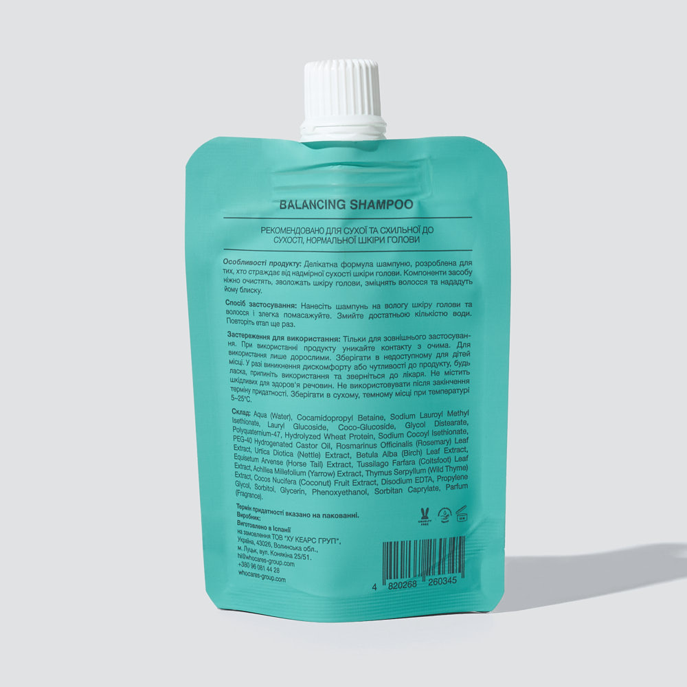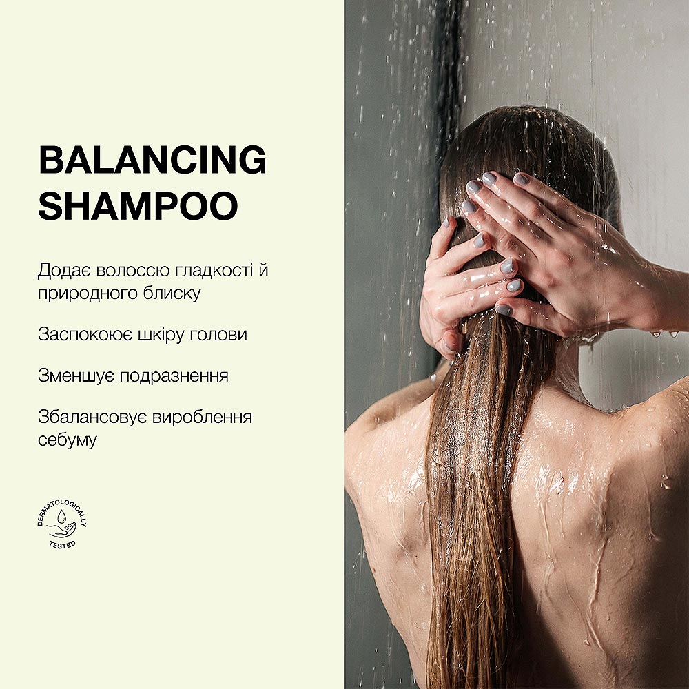 Balancing Shampoo — це збалансована формула без сульфатів, створена для ніжного, але ефективного очищення волосся та шкіри голови.